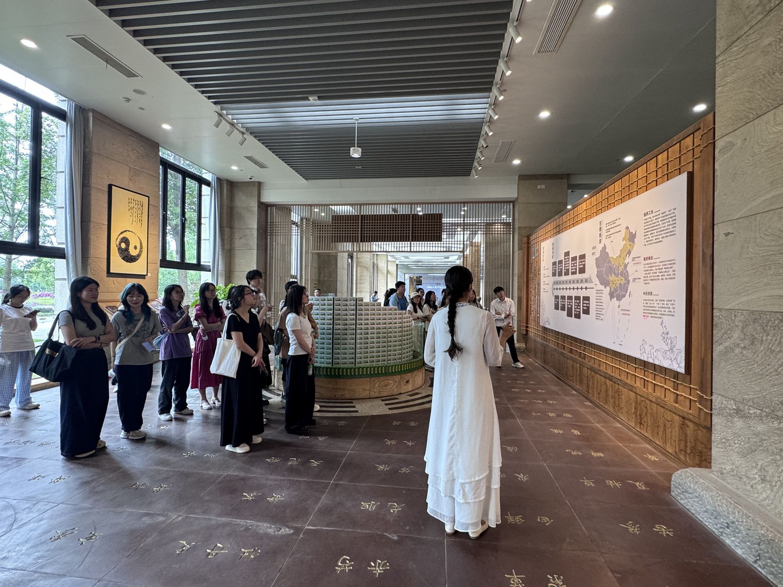 当日14时,同学们满含期待与好奇抵达国药太极。在人力资源部讲解员的引导下,员工代表团来到集团中药标本馆。这里宛如一座神秘的中医药宝库,陈列着琳琅满目的中药标本。讲解员由浅入深地介绍每味中药的来源、功效及鉴别方法,从常见的人参、枸杞到珍稀名贵药材,书本上的知识变得鲜活生动。同学们纷纷拿出手机拍照记录,并与讲解员开展热烈讨论,馆内洋溢着浓厚的求知氛围。