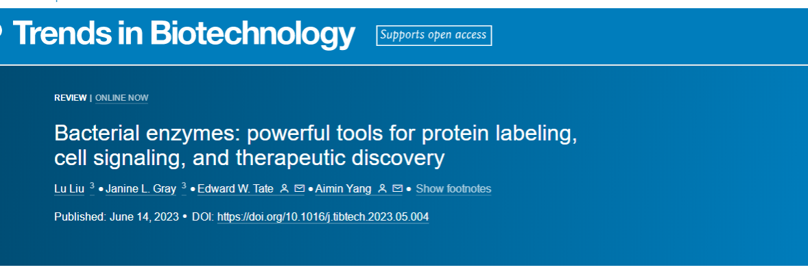 近日,美狮贵宾会杨爱民课题组联合英国帝国理工学院化学系Edward Tate教授课题组应邀在国际知名期刊《Trends in Biotechnology》(IF2022=17.3)上撰写了题为“Bacterial enzymes: powerful tools for protein labeling, cell signaling, and therapeutic discovery”的研究综述性文章。