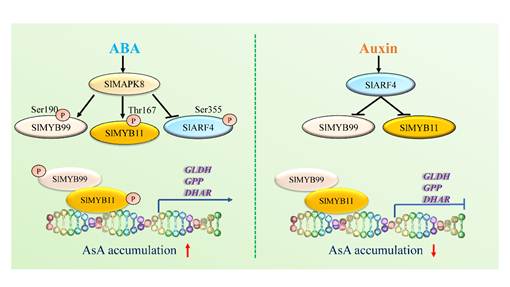 这些实验结果揭示SlMAPK8- SlARF4-SlMYB11/SlMYB99模块在番茄AsA生物合成过程中是介导生长素和ABA之间的一个重要的整合枢纽。