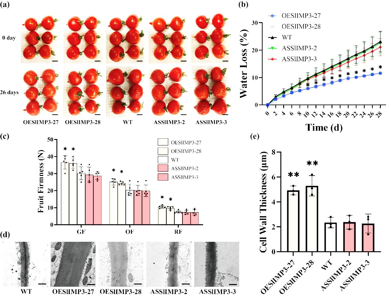 图1. SlIMP3调控番茄果实的耐储性和细胞壁厚度