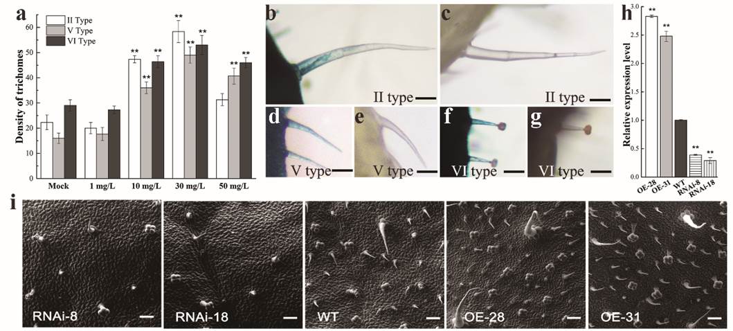 该论文对依赖R2R3 MYB的生长素信号转导通路调控番茄表皮毛形成机制进行了报导。生长素喷施番茄秧苗可大幅提高叶片表面II型,V型和VI表皮毛的密度。Aux/IAA蛋白和ARF蛋白在生长素信号转导过程中发挥了重要作用。ARF家族转录因子可发挥转录激活或抑制作用。本研究对番茄生长素响应基因SlARF4以及其下游调控网络进行了分析。量表达SlARF4基因后番茄叶片表面II型,V型和VI型表皮毛密度增加。抑制表达SlARF4基因可降低上述三种表皮毛密度。