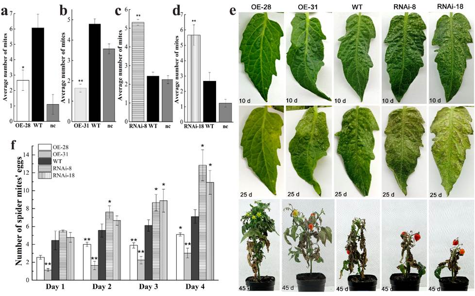 同时,在番茄中超量表达SlARF4基因可以增加番茄植株对朱砂叶螨的抗性;下调SlARF4基因可以降低番茄植株对朱砂叶螨的抗性。