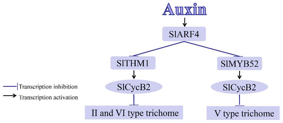 SlARF4蛋白可以抑制下游SlTHM1和SlMYB52基因表达。SlTHM1和SlMYB52通过调控下游基因SlCycB2分别调控了番茄叶片表面多细胞和单细胞表皮毛的形成。