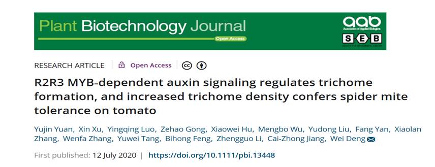 近日,Plant Biotechnology Journal在线发表了题为“R2R3 MYB-dependent auxin signaling regulates trichome formation, and increased trichome density confers spider mite tolerance on tomato”的研究论文。美狮贵宾会邓伟教授博士研究生苑瑜瑾为该论文第一作者,邓伟教授为通讯作者。
