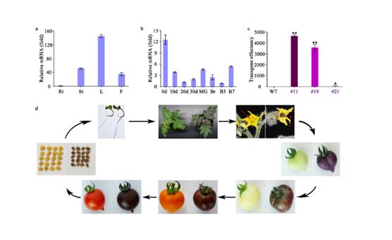花青素是一种在自然界广泛分布、抗氧化能力很强的天然植物色素,研究表明日摄入足量的花青素能够有效降低人体患多种慢性疾病的风险。然而,作为一种世界范围内广泛消费的重要经济作物,番茄果实却几乎不含花青素,因而培育富含花青素的番茄果实成为众多研究者追求的目标。2008年Nature Biotechnology杂志报道了同时超量表达两个转录因子Del和Ros1能够获得富含花青素的番茄果实Del/Ros1;2015年发表在Nature Communication杂志的文章表明转录因子AtMYB12能够进一步增加Del/Ros1果实中花青素的含量。然而这些研究中获得的紫色番茄均是通过同时超量表达2个或者3个外源转录因子来实现的,这种多基因策略在一定程度上为传统育种者带来了挑战。