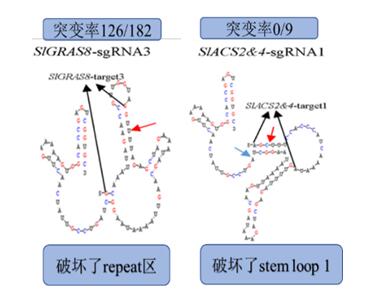 在单一靶位点克隆方面该系统更加简便,易进行高通量构建操作。在多sgRNA表达盒克隆方面,研究人员改进了前人的克隆策略,成功的实现了8个sgRNA表达盒的一步克隆组装,降低了多靶位点操作的难度。研究人员在重要的肉质果实模式作物番茄中验证了这一系统单一靶位点、多靶位点及多基因编辑能力;分析了影响编辑的因素,在前人基础上进一步证实了sgRNA二级结构是影响靶位点编辑能力的最重要因素。通过对文中涉及的两个编辑效率偏低的靶位点对应的sgRNA二级结构分析判断:靶位点与sgRNA骨架存在连续6个以上碱基互补将在一定程度上影响sgRNA的编辑效率,而且这种稳定互补位置的不同可能对编辑效率存在更大影响,例如在SlGRAS8-sgRNA3(编辑效率:126/182)的二级结构中这种稳定互补影响到了repeat区域的形成(图2左),而在SlACS2&4-sgRNA1(编辑效率:0/9)中这种稳定互补则是影响了stem loop 1的形成(图2右)。这一结果也为高效的靶位点的选择提供了重要依据。