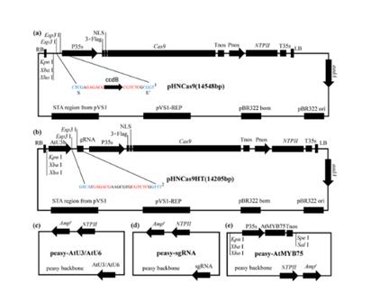 2019年1月,Horticulture Research 在线发表了美狮贵宾会博士生胡楠为第一作者、李正国为通讯作者的题为“Rapid and user-friendly open-source CRISPR/Cas9 system for single- or multi-siteediting of tomato genome”的研究论文。该研究使用标准化生物砖组装技术设计开发了一种更加开放易升级的、更易用的并适用于高通量操作的植物CRISPR/Cas9系统(图1)。这一系统包括了pHNCas9(多靶位点适用)和pHNCas9HT(单一靶位点高通量构建适用)两个植物表达载体;多个保存有AtU3/AtU6/sgRNA元件的克隆载体。研究人员利用这一系统进行了试剂盒的研发并开发了相应的靶位点特异引物设计软件提高了系统的易用性。