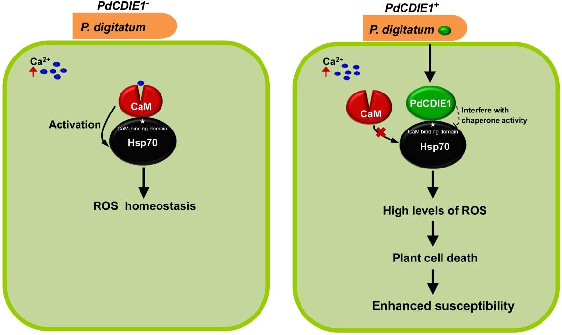 通过IP-MS、BiFC和Co-IP等实验,证实绿霉病菌效应蛋白PdCDIE1与一个柑橘热激蛋白CsHsp70互作。PdCDIE1诱导植物细胞坏死依赖于活性氧(ROS),而CsHsp70负调控植物细胞坏死。钙调蛋白(CaM)作为一种主要的Ca²⁺传感器,能够激活靶蛋白以调控多种细胞过程。研究发现,CsHsp70具有一个CaM结合域(CBD),是一个真实的CaM 靶标蛋白。PdCDIE1的N端特异性、竞争性结合CsHsp70的CBD结构域。柑橘果实中CaM与Hsp70的互作在病原菌感染过程中受到干扰,但在感染ΔPdCDIE1突变体菌株时恢复。另外,大肠杆菌蛋白热变性实验表明CsHsp70具有分子伴侣活性,而效应蛋白PdCDIE1可能也抑制其分子伴侣活性。